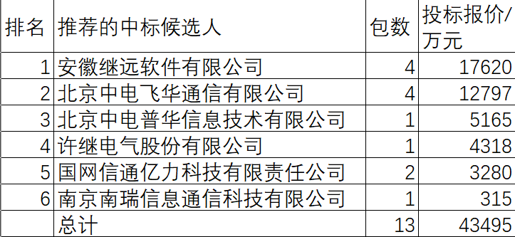 国网信通的安徽继远软件有限公司、北京中电飞华通信有限公司、北京中电普华信息技术有限公司、国网信通亿力科技有限责任公司4家企业合计中38862万元,占总金额的89.3%,处于垄断地位。