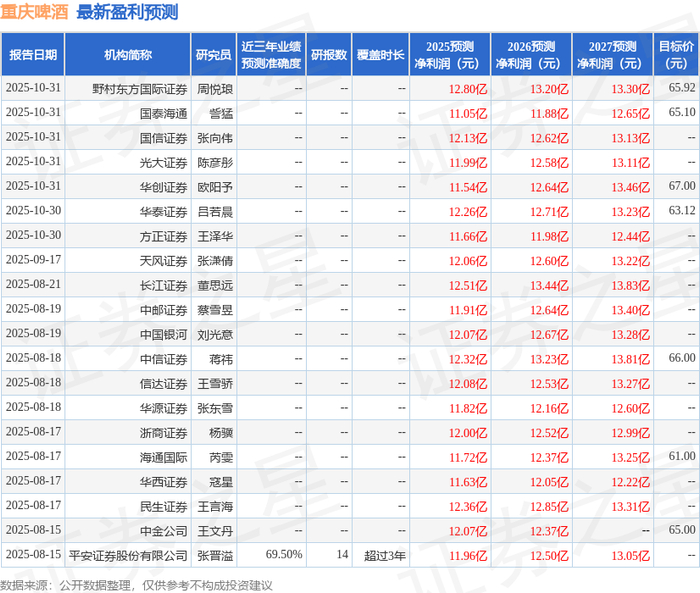 东吴证券股份有限公司苏铖,郭晓东近期对重庆啤酒进行研究并发布了研究报告《2025年三季报点评:收入韧性增长,费用加大、税率提升拖累盈利》,给予重庆啤酒增持评级。