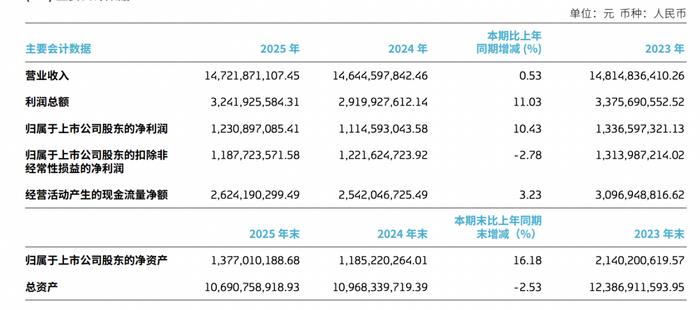 2025年,重庆啤酒营业收入为147.22亿元,同比增长0.53%;归属于上市公司股东的净利润为12.31亿元,同比增长10.43%;归属于上市公司股东的扣除非经常性损益的净利润为11.88亿元,同比下降2.78%。