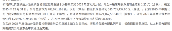 分红方面,重庆啤酒拟向全体股东每股派发现金红利1.20元(含税),合计拟派发现金红利5.81亿元(含税)。此前2025年中期公司已向全体股东每股派发现金红利1.30元(含税),合计派发中期现金红利6.29亿元(含税),公司2025年度共计派发现金红利12.1亿元(含税),占2025年归属于上市公司股东净利润的98.30%
