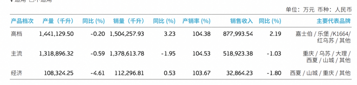 2025年,重庆啤酒的啤酒销量299.52万千升,同比增长0.68%。其中,高档产品销量150.43万千升,同比增长3.23%;主流产品销量137.86万千升,同比减少1.95%;经济产品销量11.23万千升,同比增长0.53%。另外,高档、主流、经济线的产销率均在103%以上。