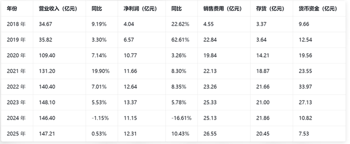 在这些业绩波动背后,成本、库存与资金端均现变化,重庆啤酒的销售费用2018-2025年从4.55亿元增至26.55亿元,八年增长超5倍;存货随也骤升至20亿元左右,高库存仍为经营待解问题;货币资金2018-2022年持续攀升后逐年回落,2025年降至7.53亿元,资金规模收缩明显。