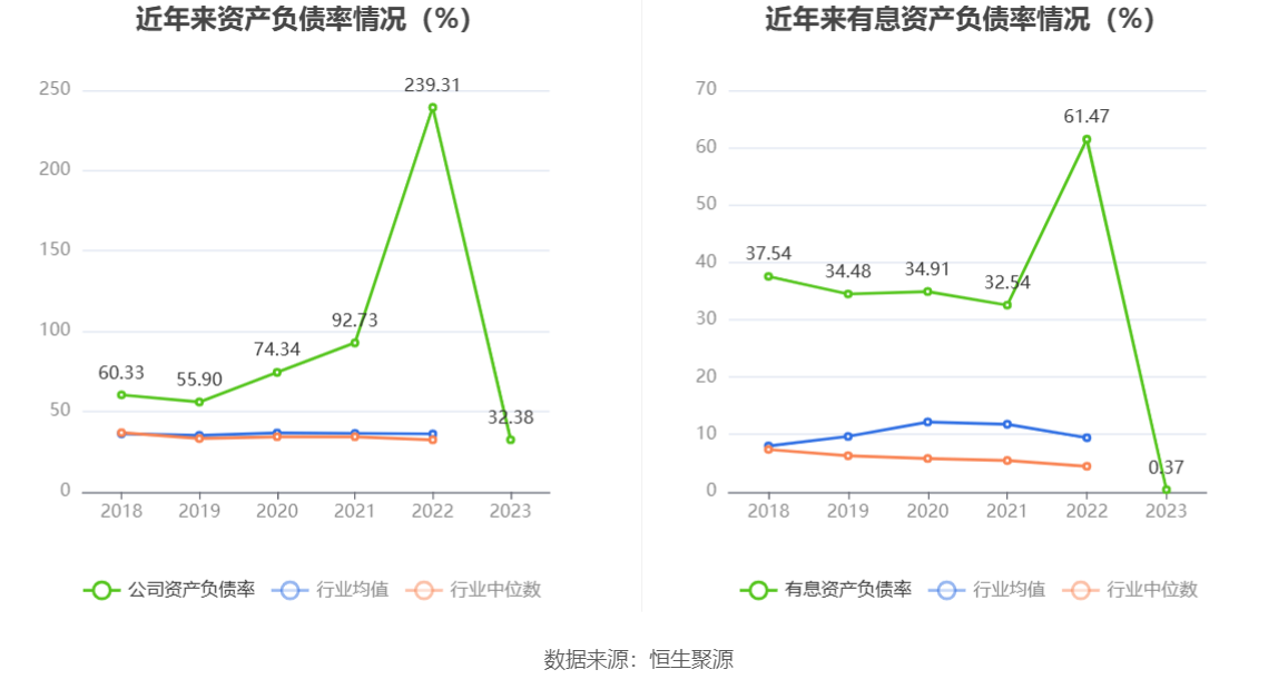 在偿债能力方面,公司2023年年末资产负债率为32.38%,相比上年末下降206.93个百分点;有息资产负债率为0.37%,相比上年末下降61.10个百分点。