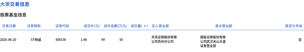 ST明诚今日大宗交易折价成交50万股,成交额99万元
