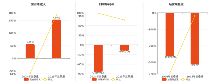公司营业总收入为4.19亿元,较去年同报告期营业总收入增加2.65亿元,同比较去年同期上涨171.13%。归母净利润为-644.01万元,较去年同报告期归母净利润增加2206.90万元,实现2年连续上涨。经营活动现金净流入为-1.07亿元。