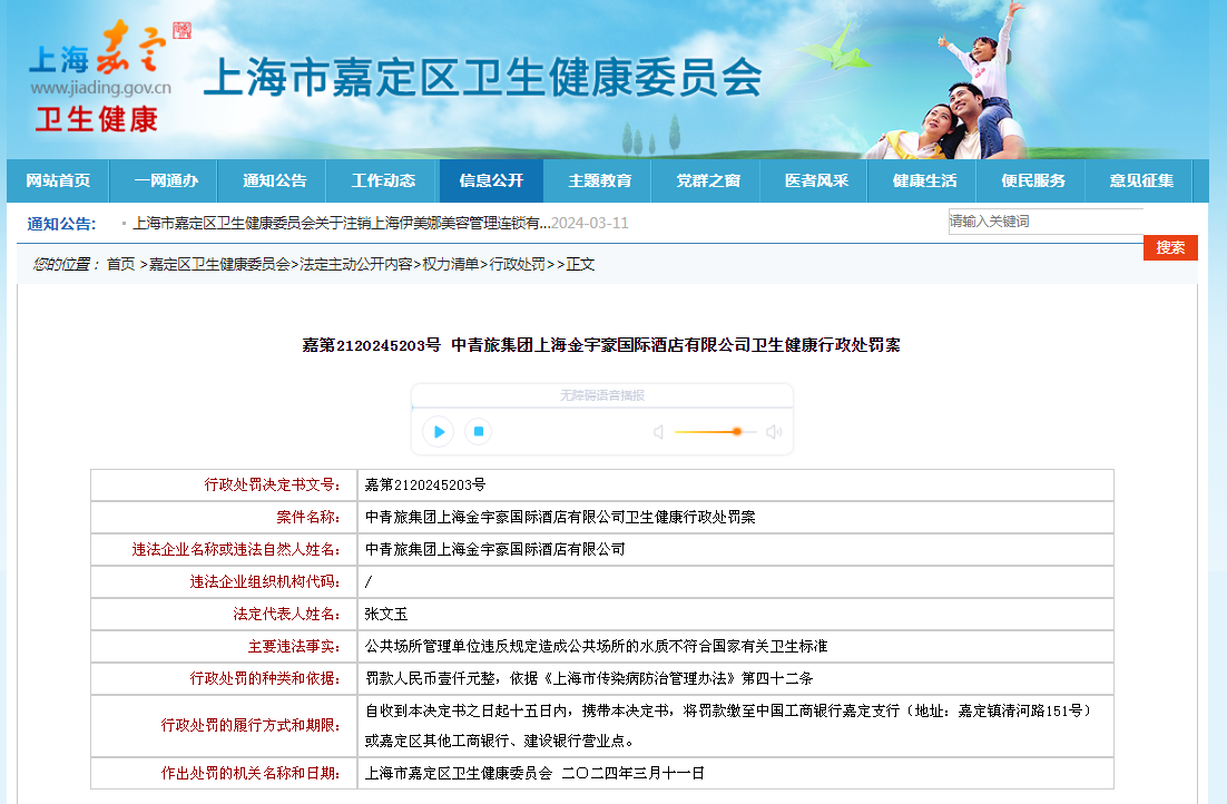 嘉第2120245203号 中青旅集团上海金宇豪国际酒店有限公司卫生健康行政处罚案