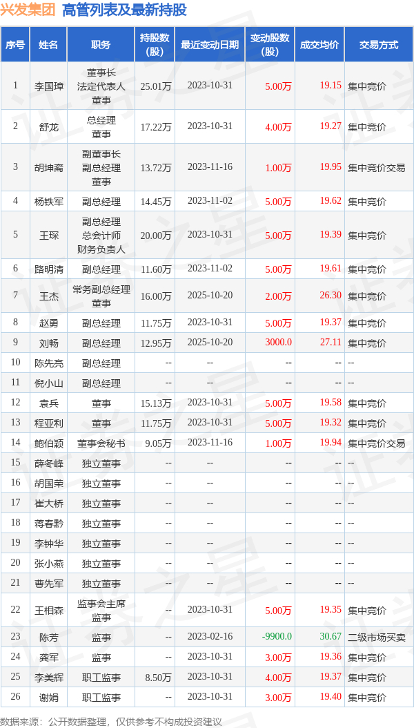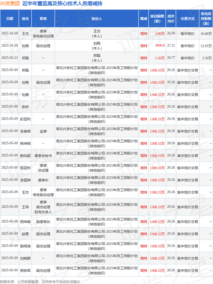 兴发集团近半年内的董监高及核心技术人员增减持详情如下: