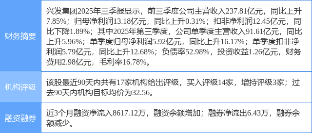2025年10月28日,开源证券研究员金益腾,徐正凤发布了对兴发集团的研报《公司信息更新报告:Q3业绩高增,前瞻布局固态电池及液冷材料》,该研报对兴发集团给出“买入”评级。研报中预计公司2025-2027年归母净利润分别为18.17(-2.45)、23.27、26.82亿元,EPS分别1.65、2.11、2.43元/股,当前股价对应PE为16.2、12.7、11.0倍。我们看好公司持续完善产业链,新旧动能转换加速向世界一流精细化工企业迈进,维持“买入”评级。证券之星数据中心根据近三年发布的研报数据计算,该研报作者对此股的盈利预测准确度为84.15%。