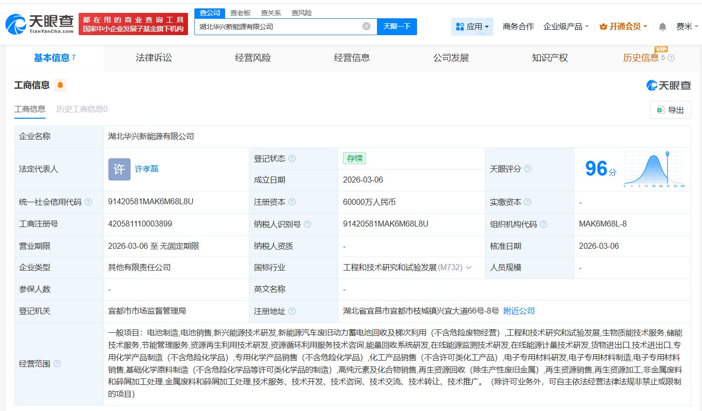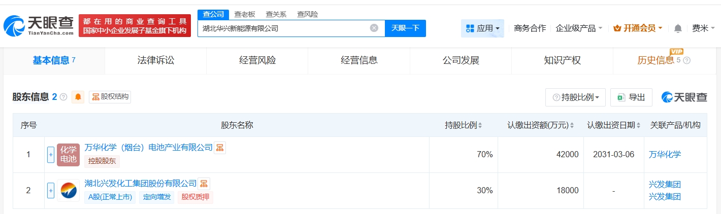 每经AI快讯,天眼查App显示,近日,湖北华兴新能源有限公司成立,法定代表人为许孝磊,注册资本6亿元人民币,经营范围包括电池制造、电池销售、新兴能源技术研发等。股东信息显示,该公司由万华化学(600309)旗下万华化学(烟台)电池产业有限公司、兴发集团(600141)共同持股。