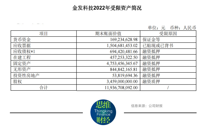 除了沉重的债务负担外,金发科技还有近120亿元的受限资产,其中,用于融资抵押的金额达到103亿元。