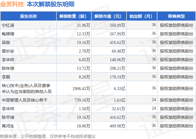 证券之星消息,根据市场公开信息整理,金发科技(600143)于9月29日将有3760.05万股限售股份解禁,为公司股权激励限售股份,占公司总股本1.43%。(本次数据根据历史公告整理得出,实际情况以上市公司最新公告为准)本次解禁后,公司还有178.67万股限售股份,占总股本0.07%。具体如下图所示: