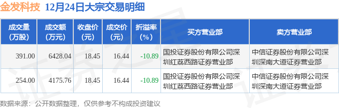 12月24日金发科技现2笔折价10.89%的大宗交易 合计成交1.06亿元