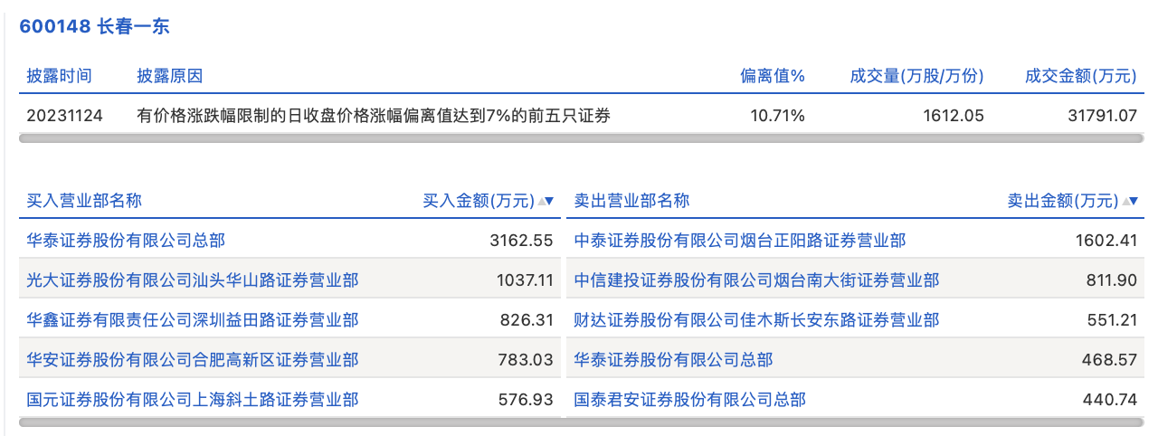 11月24日,长春一东今日涨停,全天换手率达11.39%,振幅达9%。龙虎榜数据显示,营业部席位合计净买入2511.1万元。其中,华泰证券总部、光大证券汕头华山路证券营业部分别买入3162.55万元、1037.11万元;中泰证券烟台正阳路证券营业部、中信建投证券烟台南大街证券营业部分别卖出1602.41万元、811.90万元。