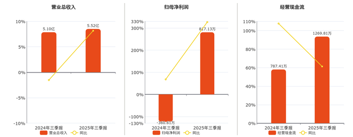 公司营业总收入为5.52亿元,较去年同报告期营业总收入增加4159.33万元,同比较去年同期上涨8.15%。归母净利润为817.13万元,较去年同报告期归母净利润增加1177.74万元,实现2年连续上涨。经营活动现金净流入为1269.81万元,较去年同报告期经营活动现金净流入增加482.40万元,实现2年连续上涨,同比较去年同期上涨61.26%。