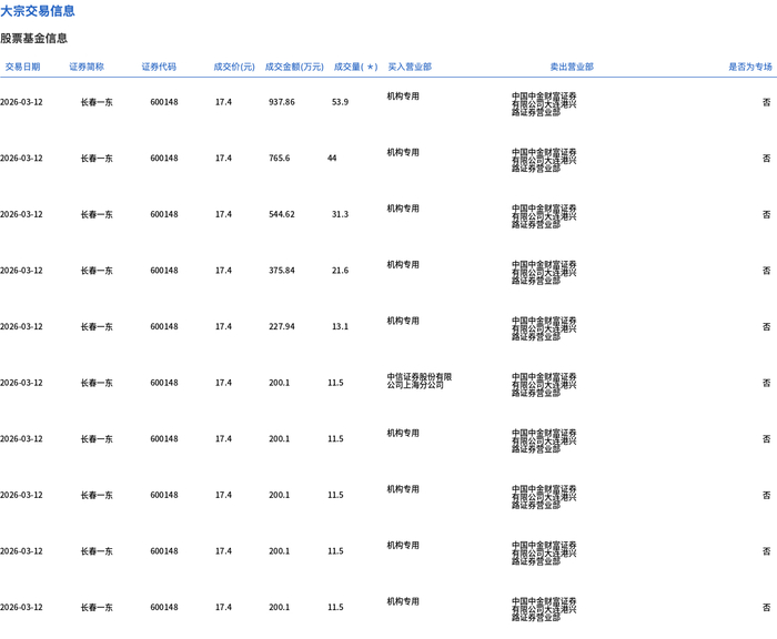 3月12日,长春一东大宗交易成交221.4万股,成交额3852.36万元,占当日总成交额的51.03%,成交价17.4元,较市场收盘价19.09元折价8.85%。