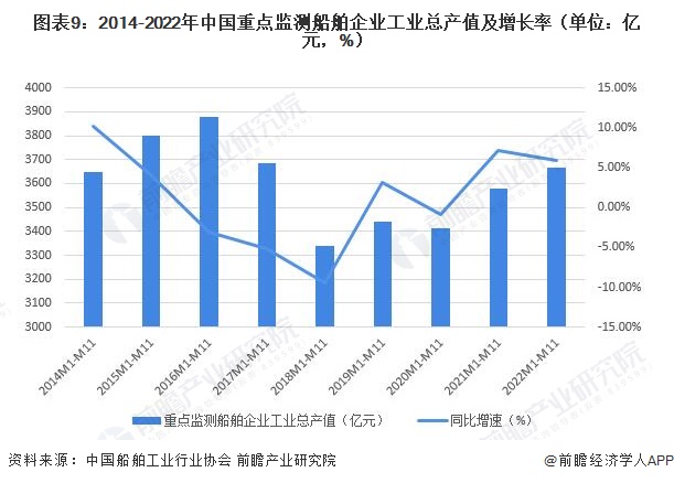 注:1)重点监测船舶企业工业总产值统计口径不同,仅在除12月以外的其他月份每月公布,故每年最多统计1-11月情况;2)每年重点监测船舶企业数量略有不同,2014-2022年重点监测企业数量分别为87、88、94、80、80、80、80、75、75和75家,故同比增速会根据企业数量进行相应调整。