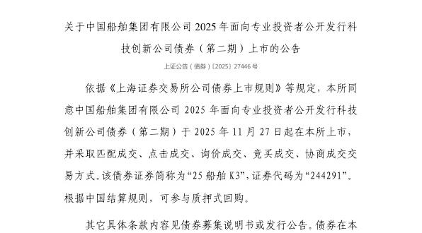依据《上海证券交易所公司债券上市规则》等规定,上交所同意中国船舶集团有限公司2025年面向专业投资者公开发行科技创新公司债券(第二期)于2025年11月27日起在上交所上市,并采取匹配成交、点击成交、询价成交、竞买成交、协商成交交易方式。该债券证券简称为“25船舶K3”,证券代码为“244291”。根据中国结算规则,可参与质押式回购。
