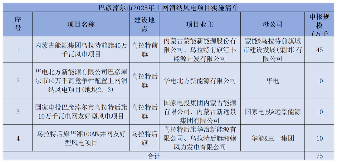根据公示,巴彦淖尔市2025年竞争性配置上网消纳风电项目共5个,规模合计75万千瓦。业主涉及蒙能、华电、国家电投等。
