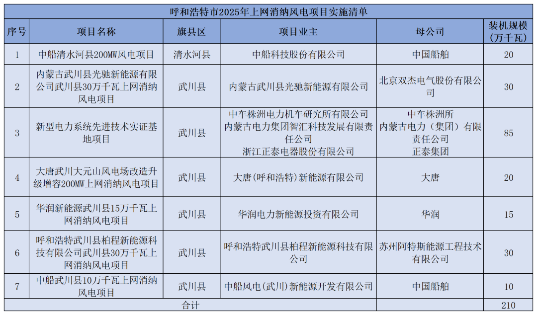 呼和浩特市2025年竞争性配置上网消纳风电项目共7个,规模合计210万千瓦。业主涉及中国船舶、华润、大唐、中车株洲所等。