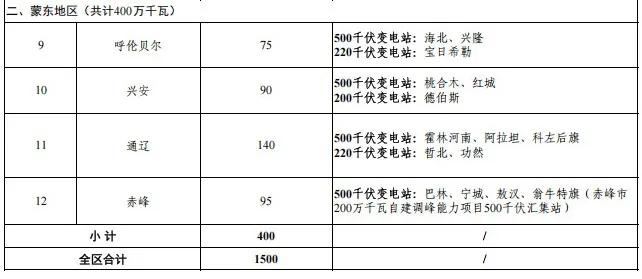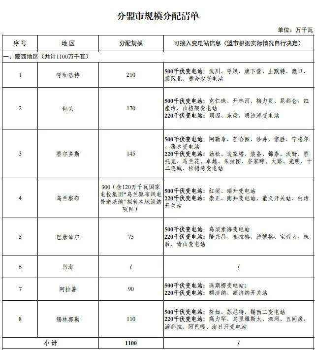 通知指出,根据全区非水可再生能源电力消纳权重目标,结合地区新能源利用率、电网接入条件等,以盟市用电负荷增速为主要依据,形成分盟市建设规模,共计划安排全区上网消纳风电项目建设规模1500万千瓦,其中,蒙西地区 1100万千瓦,蒙东地区400万千瓦。