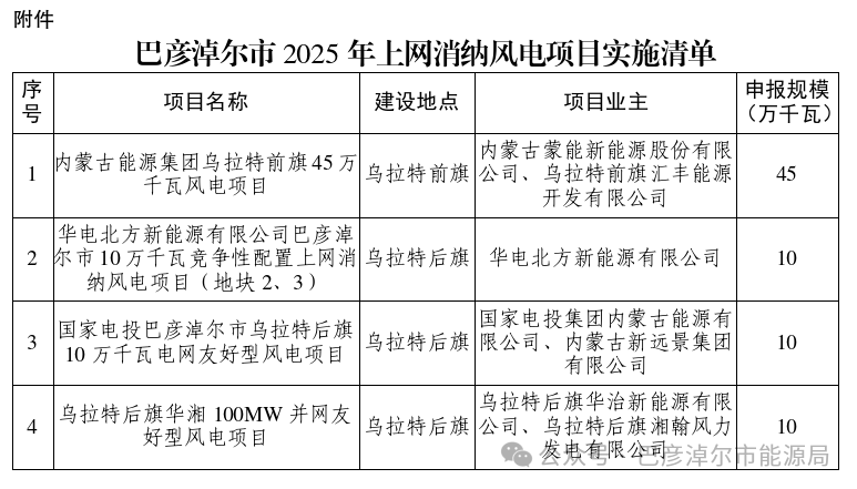 根据《内蒙古自治区能源局关于开展2025年上网消纳风电项目竞争性配置的通知》(内能源新能字〔2025〕654号)和《内蒙古自治区上网消纳新能源发电项目竞争性配置管理办法》(内能源新能发〔2025〕6号)等文件精神,巴彦淖尔市能源局委托第三方专业机构,对旗县区初审上报的项目开展了评审优选工作,经市政府审定形成了巴彦淖尔市2025年上网消纳风电项目实施清单,现予以公示。