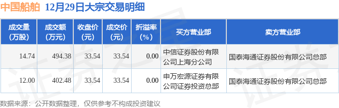 12月29日中国船舶发生2笔大宗交易 成交金额896.86万元