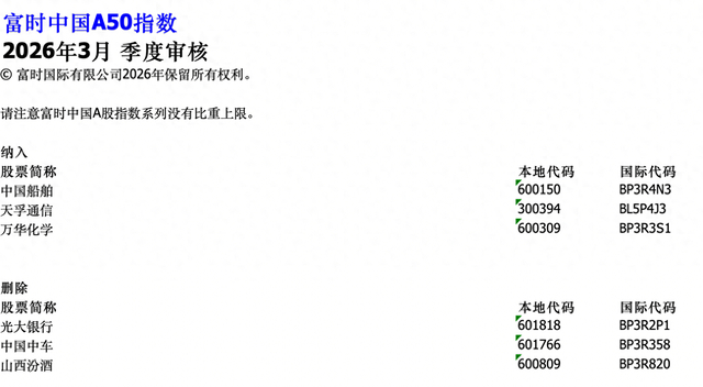 3月4日,富时罗素公布2026年3月富时中国50指数、富时中国A50指数、富时中国A150指数、富时中国A200指数以及富时中国A400指数季检结果, 3月20日星期五收盘后(即3月23日星期一)生效。