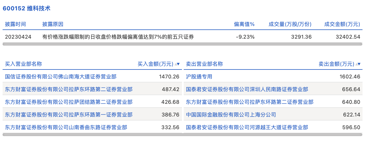 维科技术今日跌停,龙虎榜数据显示,上榜营业部席位全天成交7222.24万元,占当日总成交金额比例为22.29%。其中,买入金额为3103.69万元,卖出金额为4118.55万元,合计净卖出1014.86万元。