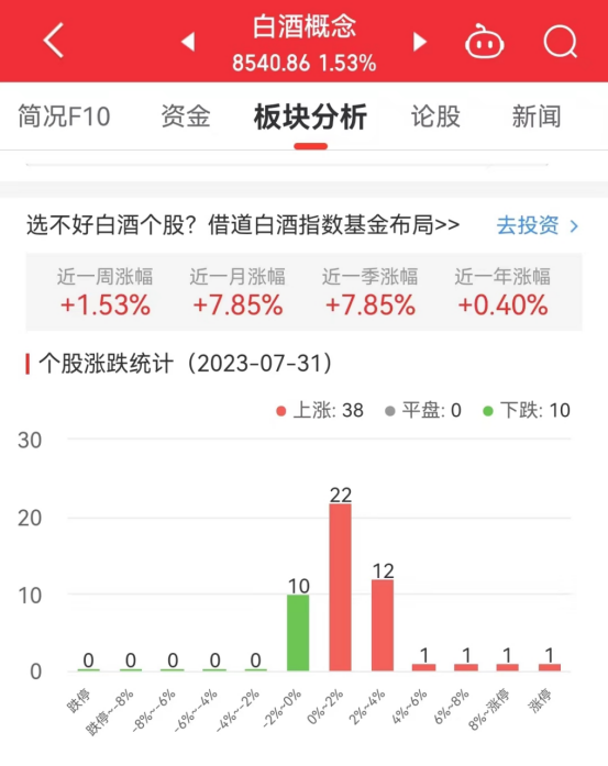 中国经济网北京7月31日讯今日,白酒概念板块整体涨幅1.53%,其中38只股票上涨,0只股票平盘,10只股票下跌。