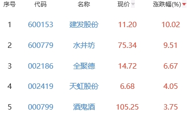 其中,建发股份、水井坊、全聚德、天虹股份、酒鬼酒位列板块涨幅前五位,涨幅分别为10.02%、9.51%、6.67%、4.05%、3.75%。