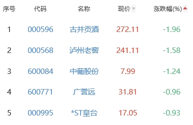 古井贡酒、泸州老窖、中葡股份、广誉远、*ST皇台位列涨幅榜后五位,涨幅分别为-1.96%、-1.58%、-1.24%、-0.96%、-0.93%。