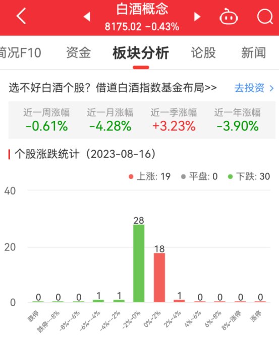 中国经济网北京8月16日讯今日,白酒概念板块整体跌幅0.43%,其中19只股票上涨,0只股票平盘,30只股票下跌。