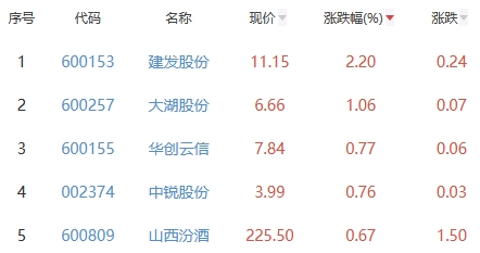 其中,建发股份、大湖股份、华创云信、中锐股份、山西汾酒位列板块涨幅前五位,涨幅分别为2.20%、1.06%、0.77%、0.76%、0.67%。
