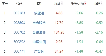 怡亚通、吉宏股份、舍得酒业(维权)、中恒集团、广誉远位列涨幅榜后五位,涨幅分别为-5.06%、-2.85%、-1.58%、-1.54%、-1.48%。
