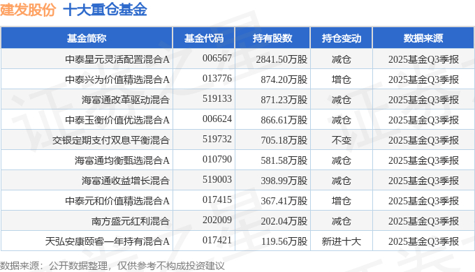 持有建发股份最多的基金为中泰星元灵活配置混合A,目前规模为42.78亿元,最新净值2.8277(10月30日),较上一交易日下跌0.08%,近一年上涨8.57%。该基金现任基金经理为姜诚。