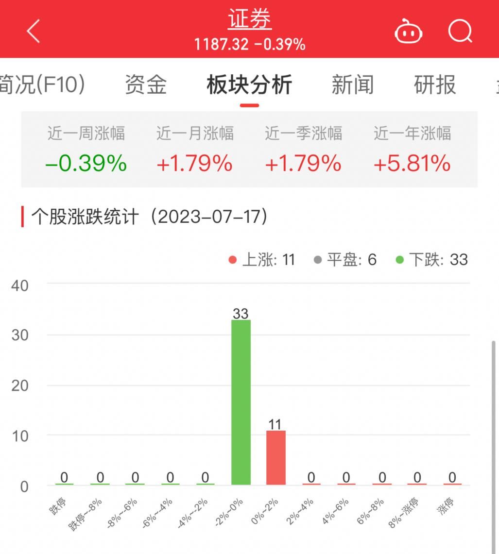 中国经济网北京7月17日讯 今日,证券板块整体跌幅0.39%,其中11只股票上涨,6只股票平盘,33只股票下跌。