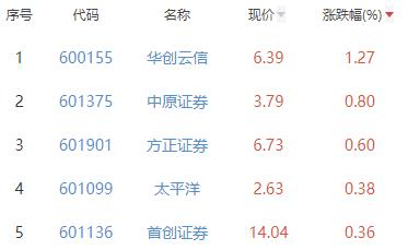 其中,华创云信、中原证券、方正证券、太平洋、首创证券位列板块涨幅前五位,涨幅分别为1.27%、0.80%、0.60%、0.38%、0.36%。