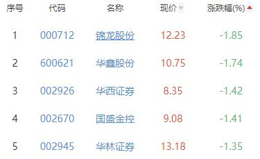 锦龙股份、华鑫股份、华西证券、国盛金控、华林证券位列涨幅榜后五位,涨幅分别为-1.85%、-1.74%、-1.42%、-1.41%、-1.35%。