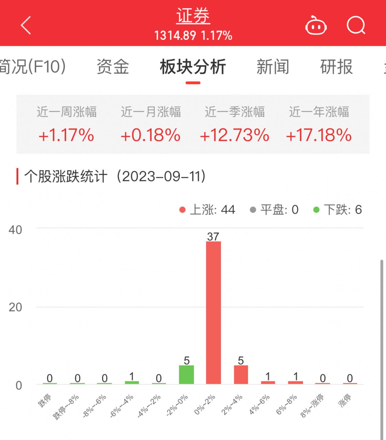 中国经济网北京9月11日讯 今日,证券板块整体涨幅1.17%,其中44只股票上涨,6只股票下跌。