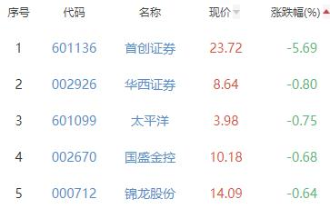 首创证券、华西证券、太平洋、国盛金控、锦龙股份位列涨幅榜后五位,涨幅分别为-5.69%、-0.80%、-0.75%、-0.68%、-0.64%。