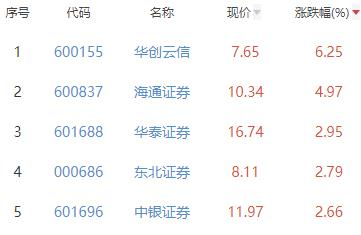 其中,华创云信、海通证券、华泰证券、东北证券、中银证券位列板块涨幅前五位,涨幅分别为6.25%、4.97%、2.95%、2.79%、2.66%。
