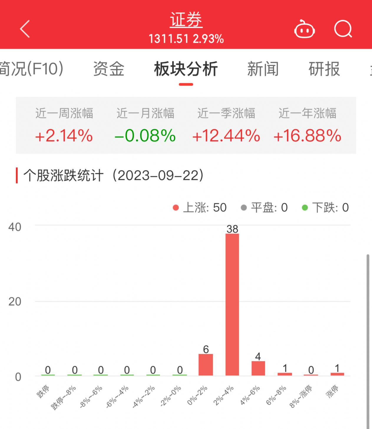 中国经济网北京9月22日讯 今日,证券板块整体涨幅2.93%,其中50只股票上涨。