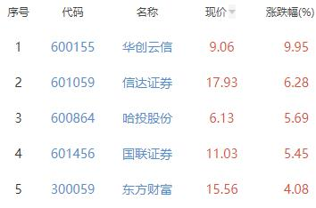 其中,华创云信、信达证券、哈投股份、国联证券、东方财富位列板块涨幅前五位,涨幅分别为9.95%、6.28%、5.69%、5.45%、4.08%。