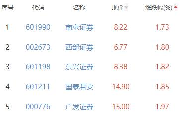 南京证券、西部证券、东兴证券、国泰君安、广发证券位列涨幅榜后五位,涨幅分别为1.73%、1.80%、1.82%、1.85%、1.97%。