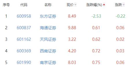 东方证券、海通证券、天风证券、西南证券、南京证券位列涨幅榜后五位,涨幅分别为-2.53%、0.61%、0.62%、0.72%、0.75%。