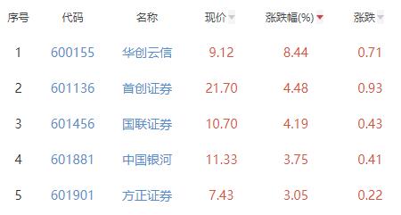 其中,华创云信、首创证券、国联证券、中国银河、方正证券位列板块涨幅前五位,涨幅分别为8.44%、4.48%、4.19%、3.75%、3.05%。