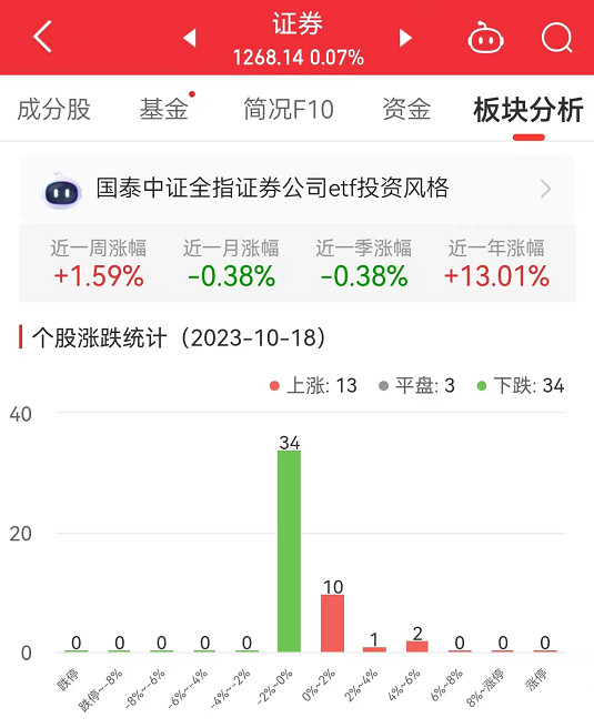 中国经济网北京10月18日讯 今日,证券板块整体涨幅0.07%,其中13只股票上涨,3只股票平盘,34只股票下跌。
