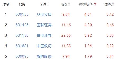 其中,华创云信、国联证券、首创证券、中国银河、湘财股份位列板块涨幅前五位,涨幅分别为4.61%、4.30%、3.92%、1.94%、1.79%。