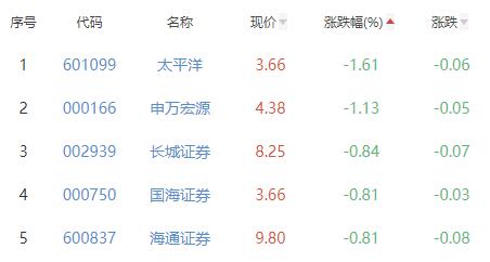 太平洋、申万宏源、长城证券、国海证券、海通证券位列涨幅榜后五位,涨幅分别为-1.61%、-1.13%、-0.84%、-0.81%、-0.81%。