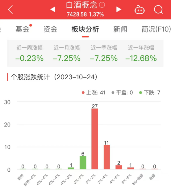 中国经济网北京10月24日讯今日,白酒概念板块整体涨幅1.37%,其中41只股票上涨,0只股票平盘,7只股票下跌。
